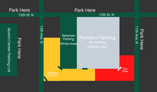 Sunday9:30 AMEnglishEnglishENNewman parking limited to the white lines. Street parking and alumni center parking available across the street. Those parked in yellow lines could be ticketed or towed by the View.5:00 PMEnglishEnglishENStarting August 24th (during the NDSU school year)