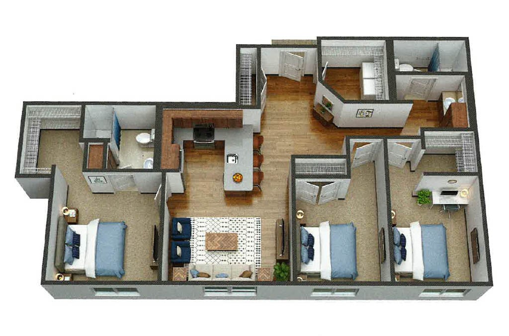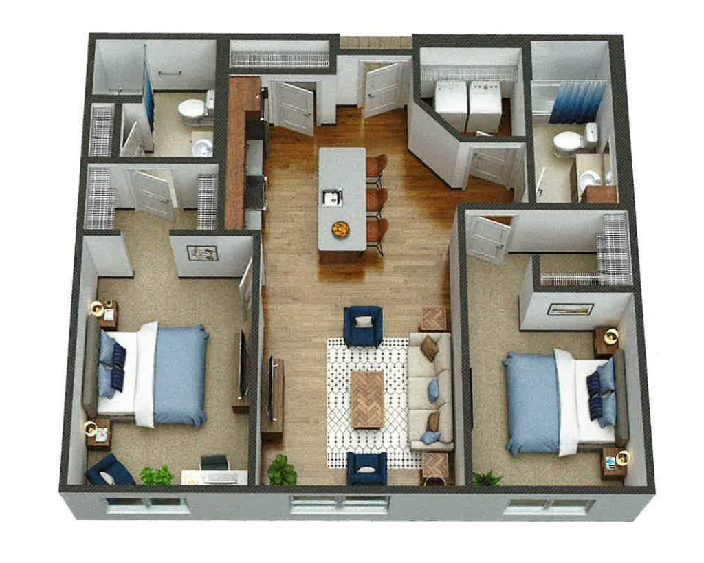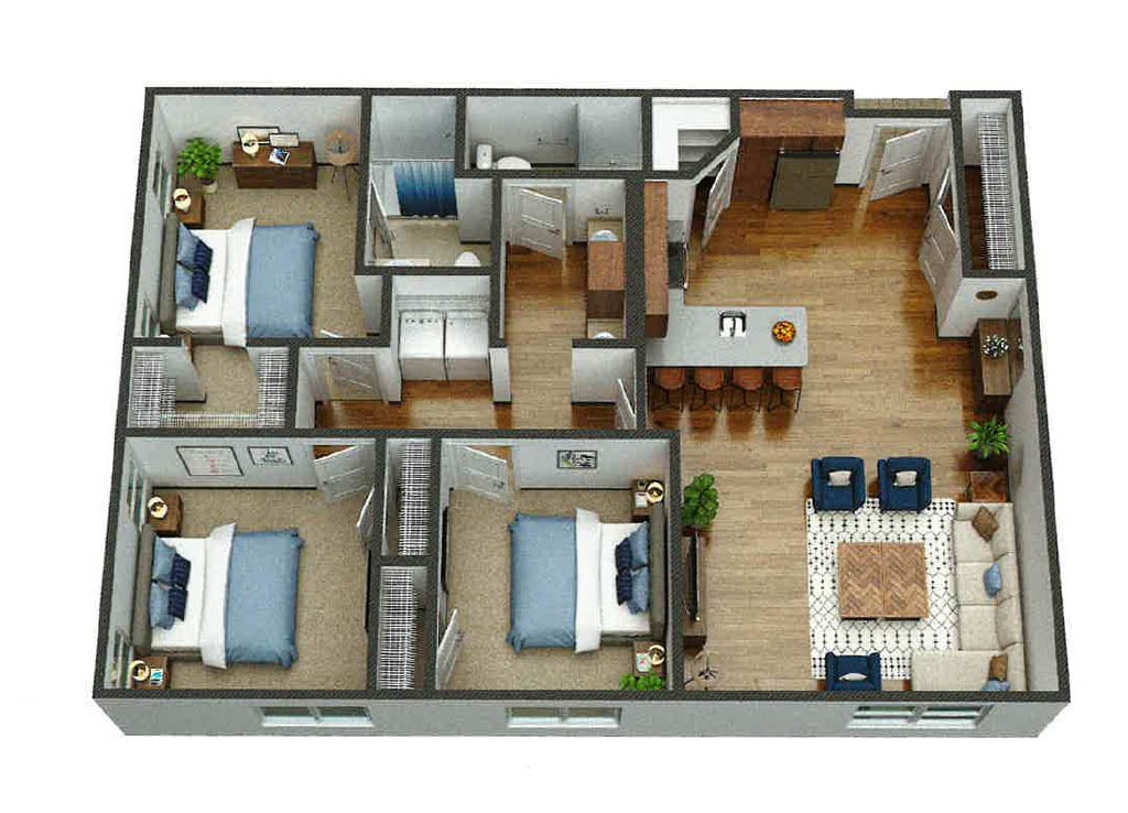 Efficiency to 4-bedroom apartments can be rented dependent on availability for a 12-month leasing period. All apartments have in-unit laundry, a full-size kitchen, individually controlled air conditioning/heating, and access to surface and underground parking spaces (for an additional cost). Residents will have access to lounges, a fully equipped fitness studio, and have 24-hour access to the main Newman Center chapel for prayer.
